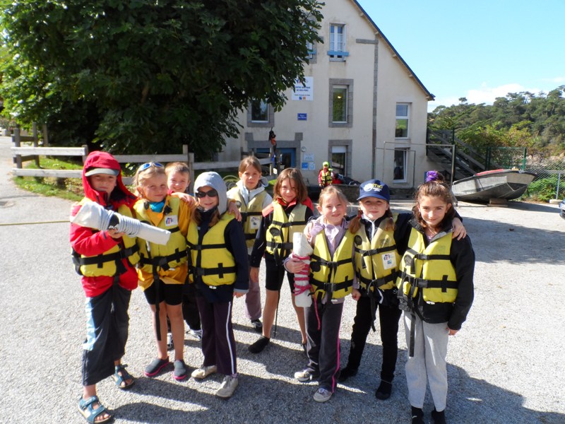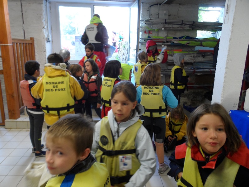 Pendant ce temps, les CE2 font la connaissance de Véro et de Bruno, les moniteurs qui nous encadrent pour la voile. Nous commençons par nous rendre à la voilerie et apprenons à nous équiper pour aller sur l’eau.